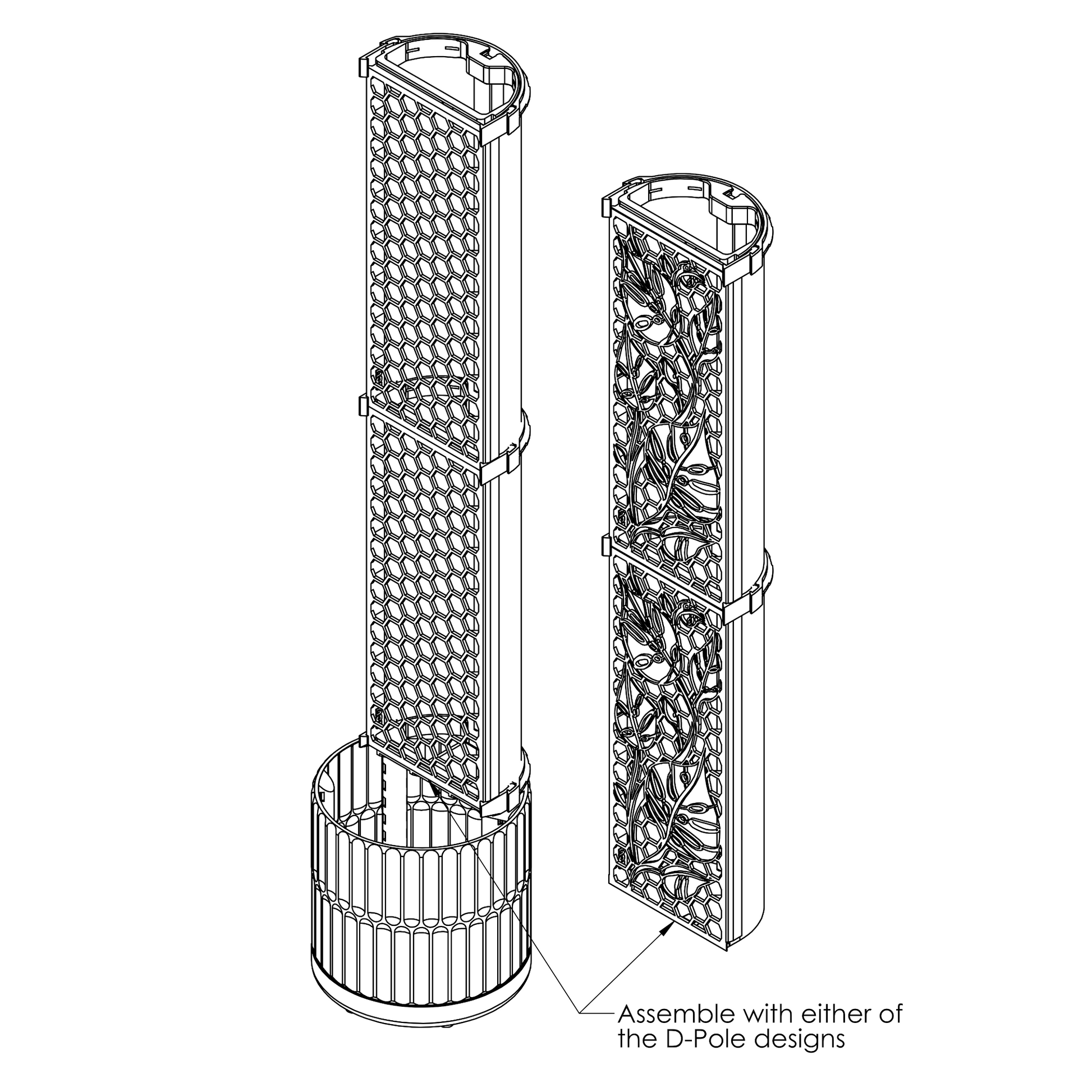 This planter provides the most stable perpendicular connection to the D-Pole sections, assembled by snapping in the face and backbone directly into the connection points provided on the planter. The planter floor is an fine mesh hovering over the drainage plate, allowing all the excess water, by-product of keeping your pole moist, to flow freely into the cache plate; the walls of the planter also have thin slits to speed up drainage that way.