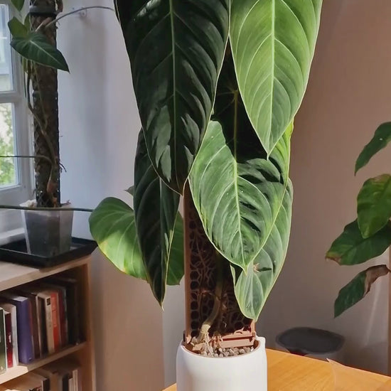 The workhorse of our product line, you can have practically any plant make its home in this rigid, large 6 cm diameter moss pole. Our customers have planted Monsteras, Philodendrons, Syngoniums, Epipremnums, and many more varieties on this sturdy trellis. When you need your moss pole to extend longer than a person is tall, this is the line to choose. It also carries the advantage of being compatible with our line of moss pole integrated planters, so you are easily able to transfer your rooted stem to a centred and supported planter.