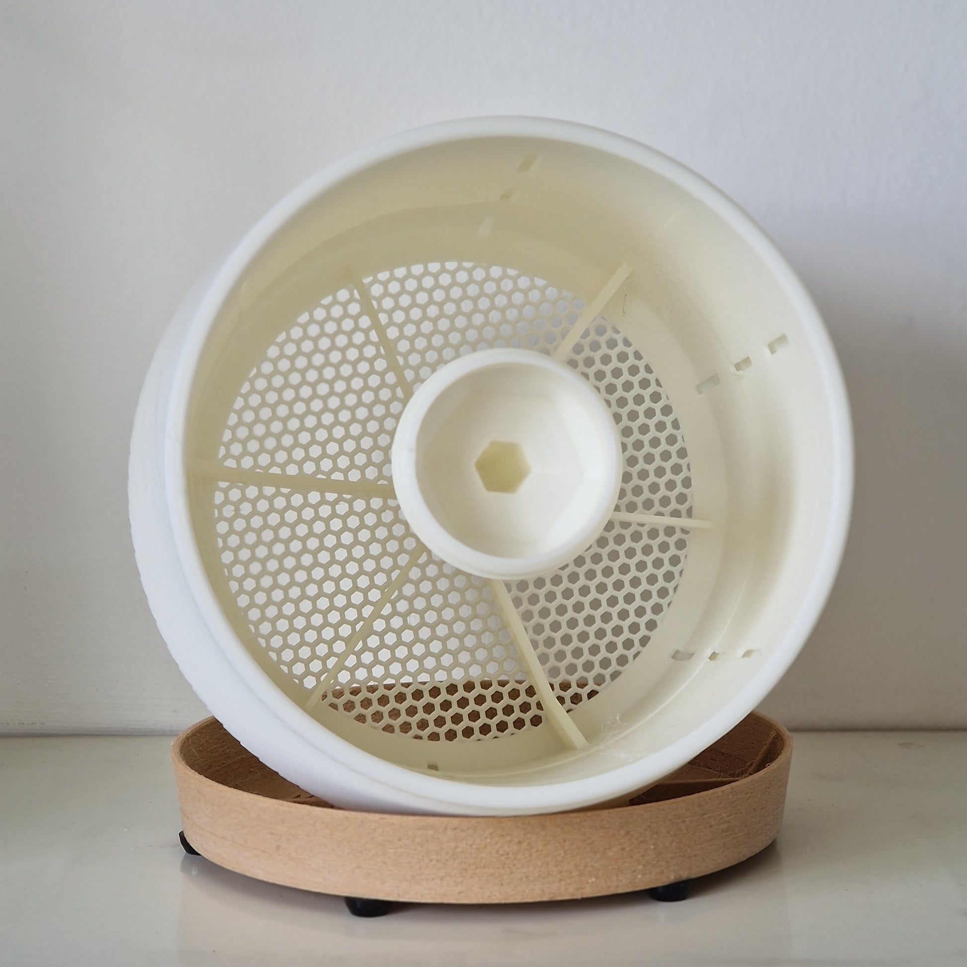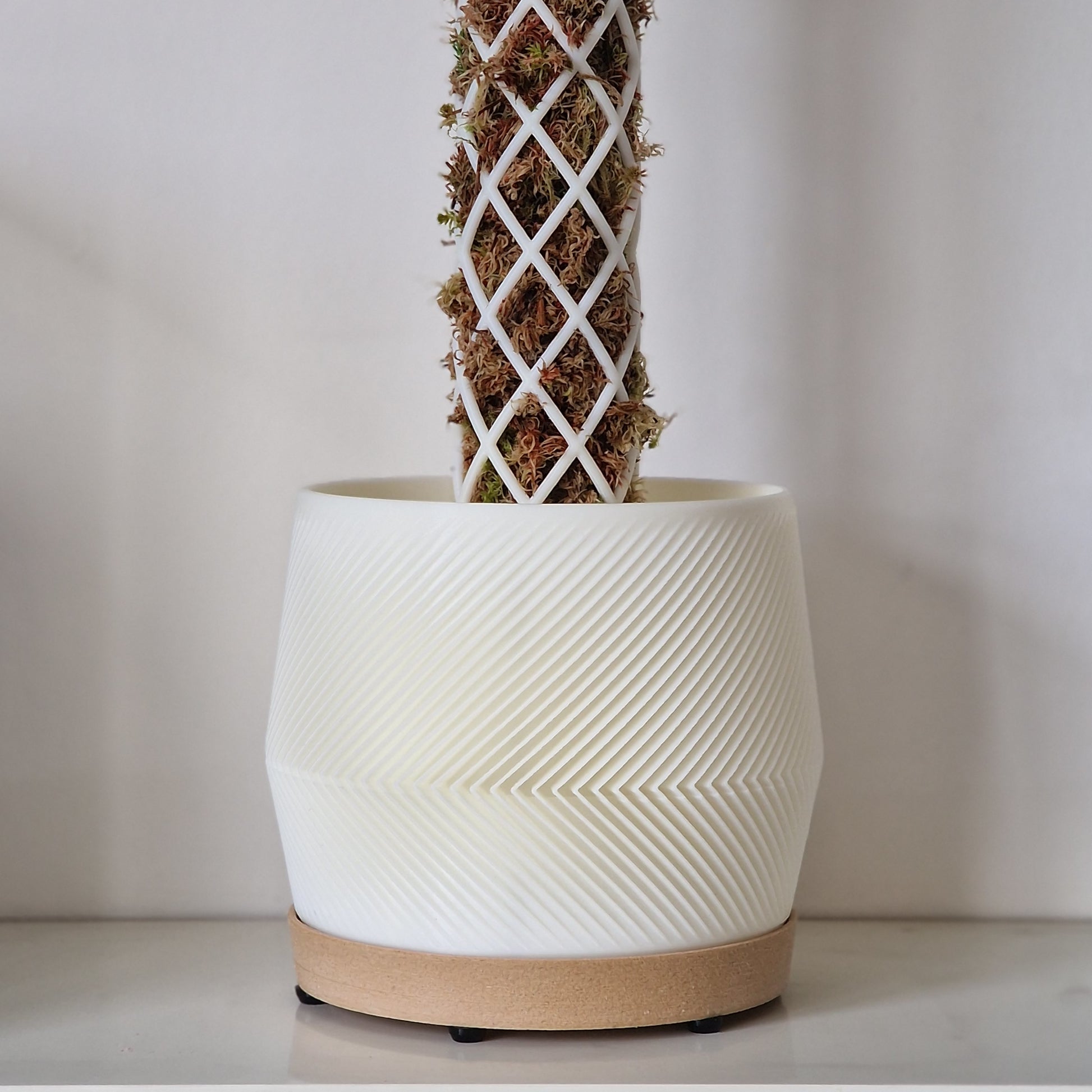 This design integrates our existing moss pole design into a lightweight, shelled out planter, giving the moss pole a centred anchor point that will remain perpendicular no matter which way your plant decides to lean. The planter floor is an open mesh hovering over the drainage plate, allowing all the excess water from keeping your pole moist to flow freely into the cache plate; the walls of the planter also have thin slits to speed up drainage that way.